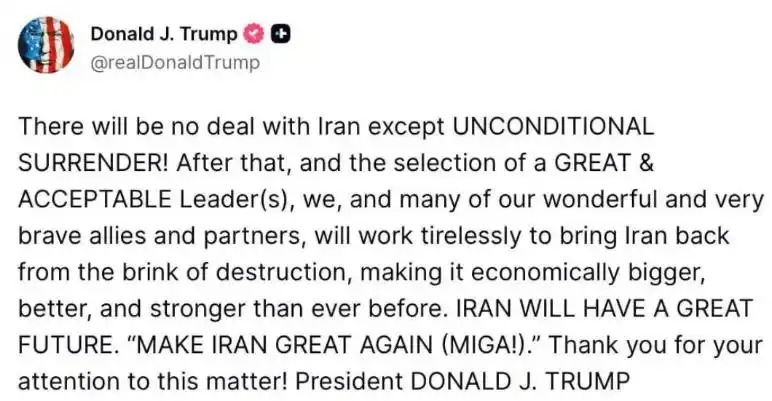 于是急得团团转的特朗普开始在网上诱降伊朗,3月6日,他在社交平台上表示:除无条件投降外,美国不会与伊朗达成任何协议。此外特朗普还承诺向伊朗提供经济援助,美国及其盟友与伙伴将共同努力,帮助伊朗摆脱几近崩溃的状态,使其经济变得比以往更强大、更美好。这话翻译翻译就是:只要你现在能够缴枪投降,皇军保证你荣华富贵、金票儿大大滴!特朗普甚至连颠覆伊朗政权这事也不提了,只是说伊朗投降后才能选出“伟大且像样的”领导人。至于所谓的无条件投降,压根就不需要伊朗开条件,特朗普自己主动准备好了,这哪是逼降,完全就是诱降。